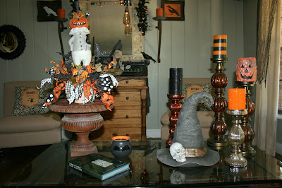 This is where I ended up putting the new Yankee Candle witch's boots. For some reason, I didn't like how any of their candles looked in here so I added my little votive arrangement. I love that you can see one of the Halloween doilies my Mom made. I smile every time I look at it because it was not something she wanted to do. She was going between my house and my brother's at this time as my step father was in a rehab center and Mom didn't want to be alone. We were trying to keep her busy with all kinds of things but she missed being in her own home and being "in charge". She had kind of given up on her crocheting saying her eyes weren't good enough and her hands hurt but we knew if we could just get her started, she would take off running...and she did but she wasn't quite sure what to make of our choice of orange and black thread. She was quite the traditionalist and always used either white or ecru. We were all so happy to get these Halloween cuties and bring them out every year!