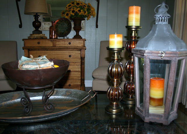 I still love this arrangement I bought at Julie's oh so many years ago but, back then, it didn't have the sunflowers. I added them a few years ago so they would fit my theme for this time of year. I can simply pull them out and still use this arrangement many other times of the year.