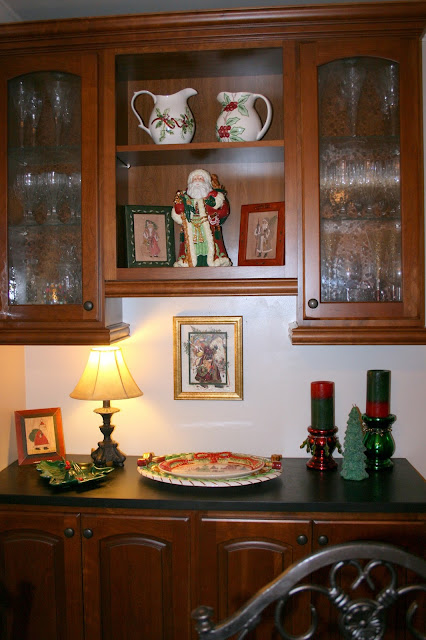 But, I digress! I started that whole story to point out the red sleigh and the small Santa and bag salt & pepper shakers sitting on the shelf. One year my mom hit an antique store and bought those for me. Not only did she know that I loved "old" things but she knew how much I loved my Christmas decorating. I still love them and think of her thoughtfulness every year that I put them out!
