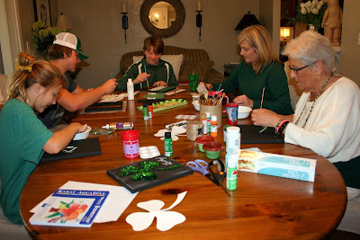 While they were baking, we started on our crafts...and my daughter's MIL joined us for this. I gave them two different options and, I guessed correctly-the girls chose the more tedious and glitzy sequin shamrock and the boys went with the painted option.