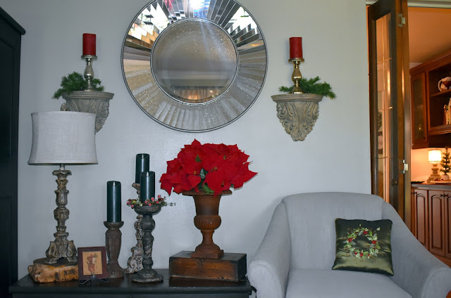 I usually put my vintage ornaments resting on a bed of fresh greens into this dough bowl. I tried to make it work with the faux greens but it just didn't look right so daughter #3 suggested I fill it with this arrangement...which I didn't have room for anywhere else this year...and I'm OK with it. I ended up putting the ornaments in a large silver bowl...and I now don't know where to put it either. Lol