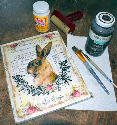 That's it for the sunroom. But, before we leave, let's revisit my last post. I showed you my new bunny picture that I absolutely love...and I told you I thought I had made a pallet picture last year using almost the same image. As soon as I published that post I headed to my Easter Rubbermaids. Luckily, things like this are stored inside where there is climate control so it wasn't hard to find what I was looking for and yes, I think the two images both came from the same original image. There were minor differences but, since I think they will both end up in the living room, I thought they were too similar. Luckily, I have no lack of images downloaded so I found another bunny with the lettering that I love, printed him out, ripped his edges and ModPodged him right over the other. Then, I gave him a bit of distressing.