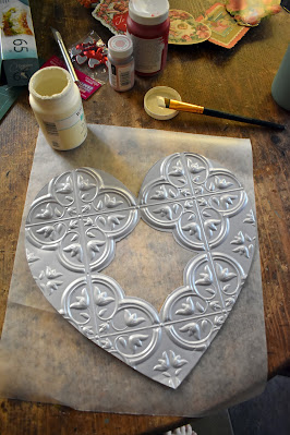 In any case, my first job was to take off the lace roses I had glued on the heart last year-way easier said than done this time. Usually, I can peel things like this off of wood but these were not moving so I pulled out the glue gun and used the heat of the tip to melt last year's glue-again, easier said than done. I really had to struggle with these but, in the end, I made it!