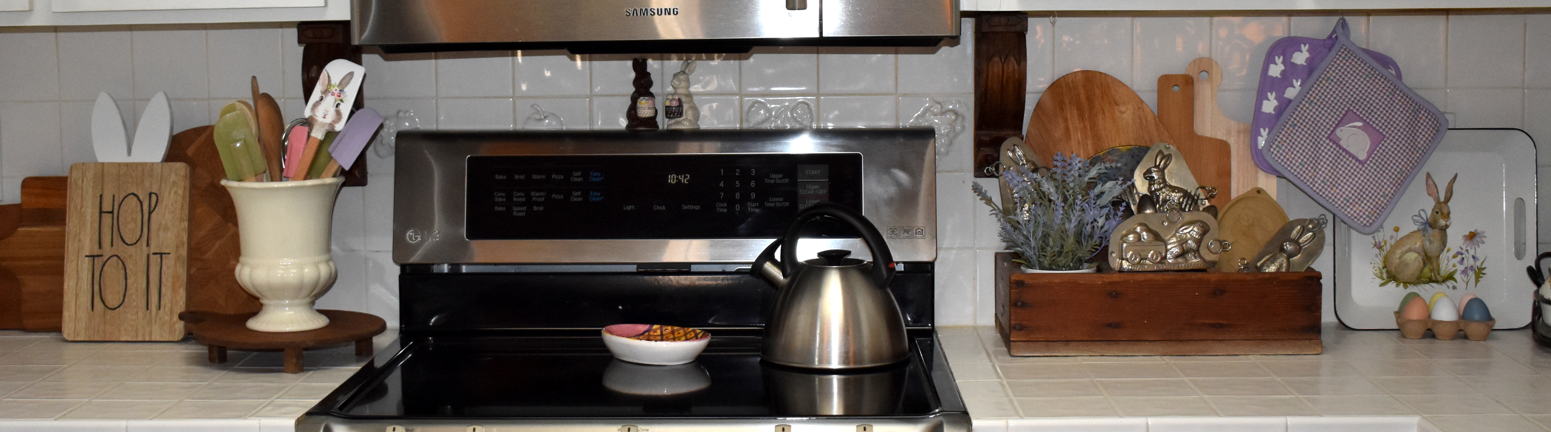 This was the one room that I really wanted to change up this year...the carrots aren't working for me anymore. But, since I need time for trial and error, a change this year just wasn't in the cards with the short amount of time I had to get decor out after St. Pat's came down. And so, I will live with this this year and maybe I will get the time to change it up next year. At least it will give me something to think about for 12 months. Lol